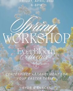 The Details: Join us for a fully guided, hands-on workshop where you will craft an elegant spring centerpiece – just in time for Easter! This is a ticketed event, so be sure to reserve your spot! Feel free to bring your own beverages and snacks to enjoy while you create.